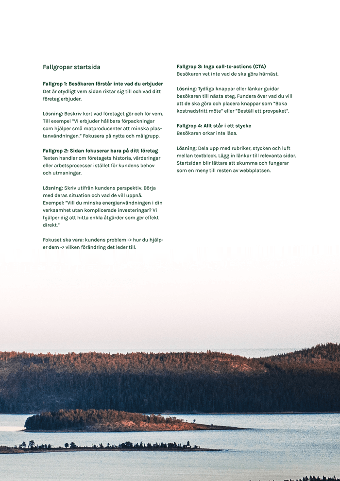 Du hittar specifika tips för fyra av webbplatsens vanligast sidor: startsida, kontakt, om oss och tjänster/produkt.